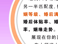 本单元将透过精准的八字命理剖析您与另一半的婚姻匹配度,你们的婚姻等级、婚后满意率、婚后体贴率、婚后融洽率、姻缘走势,将完整展现在您面前,并有大师送上达成幸福婚姻生活之建议!