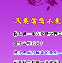 俗话说“只羡鸳鸯不羡仙”,你与另一半在婚姻的世界里,是成天难分难舍的天生一对,还是各自拥有一片空间的欢喜冤家?你们的婚姻是否美满?姻缘走势如何?你们婚后的相处模式又将是如何?
